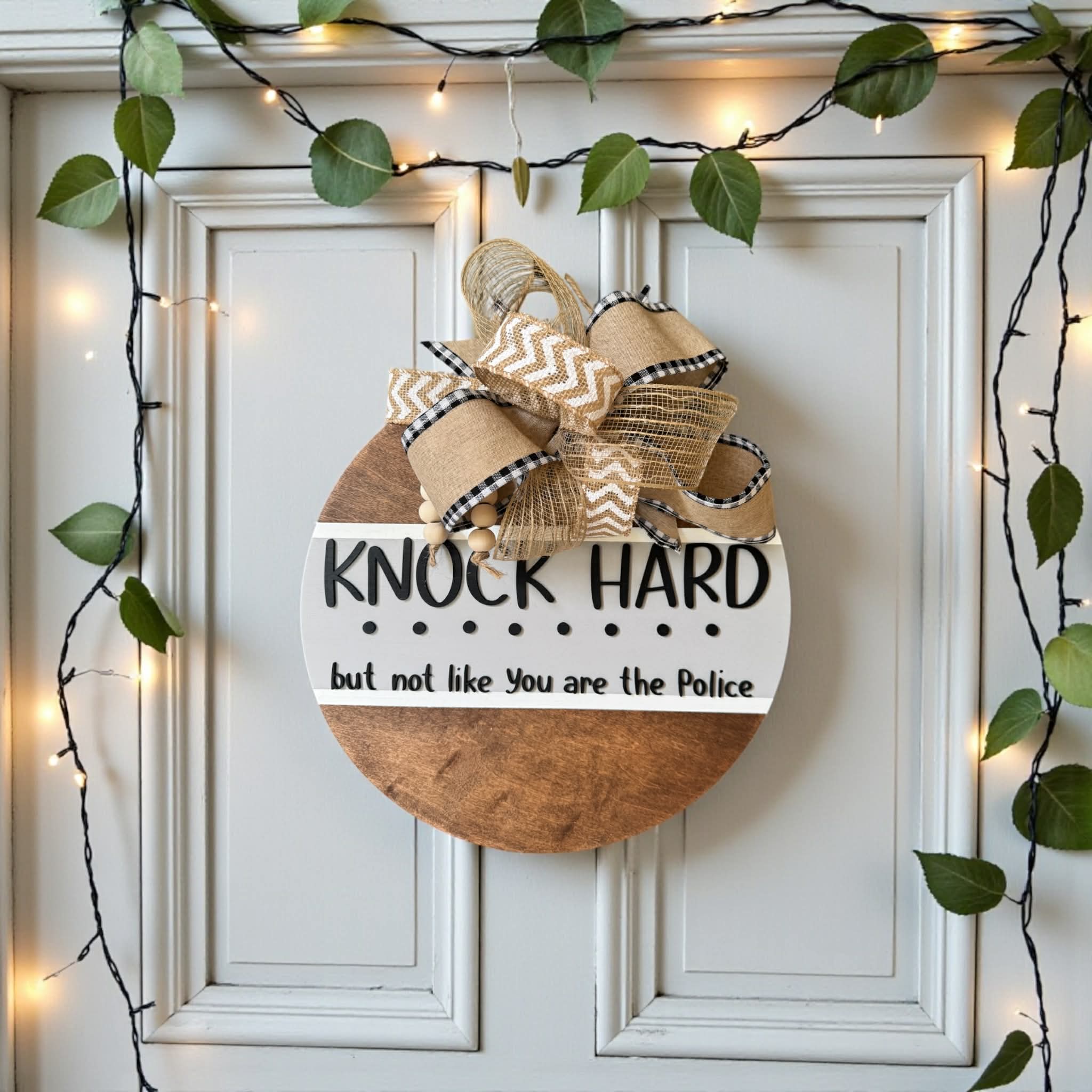 Welcome guests with a laugh! This handcrafted 15-inch wooden door sign features the playful phrase “Knock Hard… but not like you are the police” — perfect for adding humor and personality to your front door, porch, or entryway.