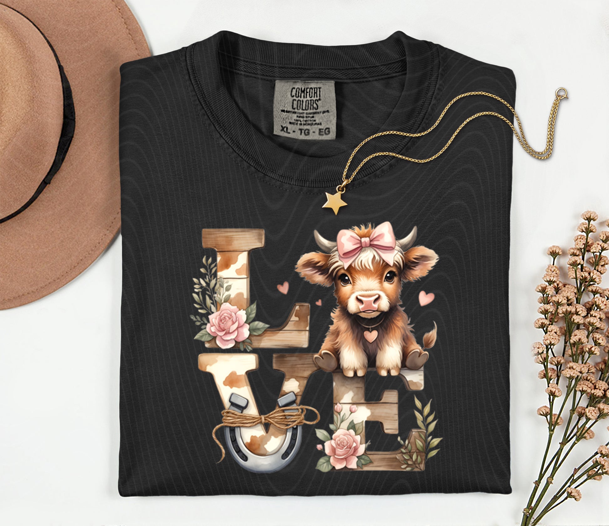 Fall in love with this adorable LOVE Highland cow graphic tee 🐮💕 Featuring a sweet baby cow with a bow, rustic wood-style lettering, florals, and a lucky horseshoe detail, this shirt blends cozy country charm with Valentine sweetness.