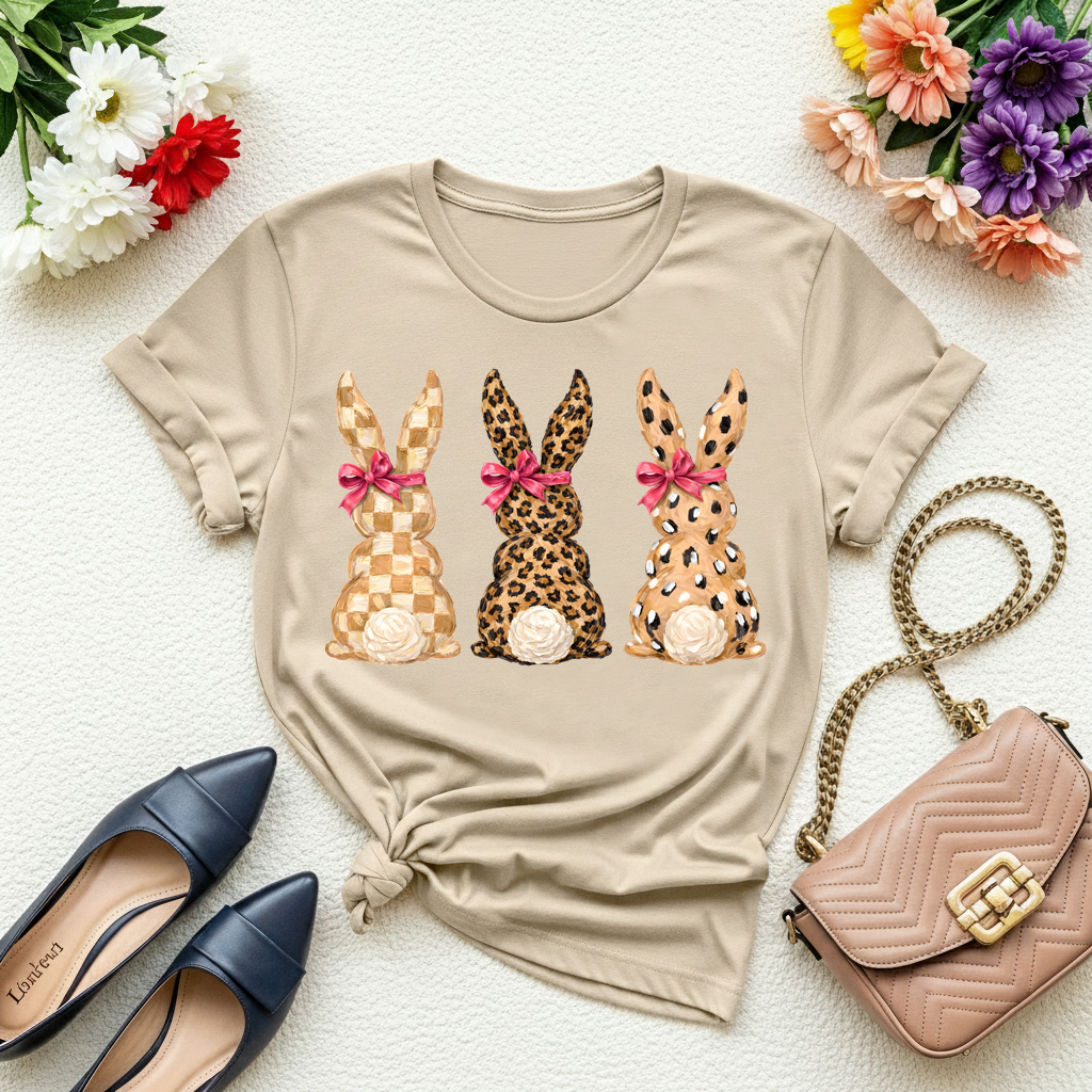 The Patterned Bunny Trio Graphic Tee features three adorable hand-painted style bunnies, each with a unique pattern and finished with a sweet pink bow. This design brings cozy spring charm with a touch of farmhouse flair, making it perfect for Easter season or year-round bunny lovers.
