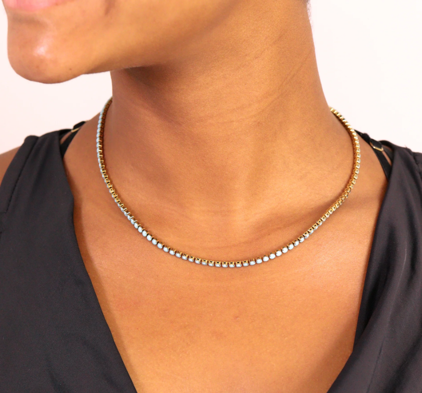 This Turquoise Stone Tennis Necklace features a continuous row of vibrant turquoise-colored stones set in a sleek gold finish for a polished, eye-catching look. Designed to elevate any outfit, this necklace is lightweight, comfortable, and perfect for both everyday wear and special occasions.