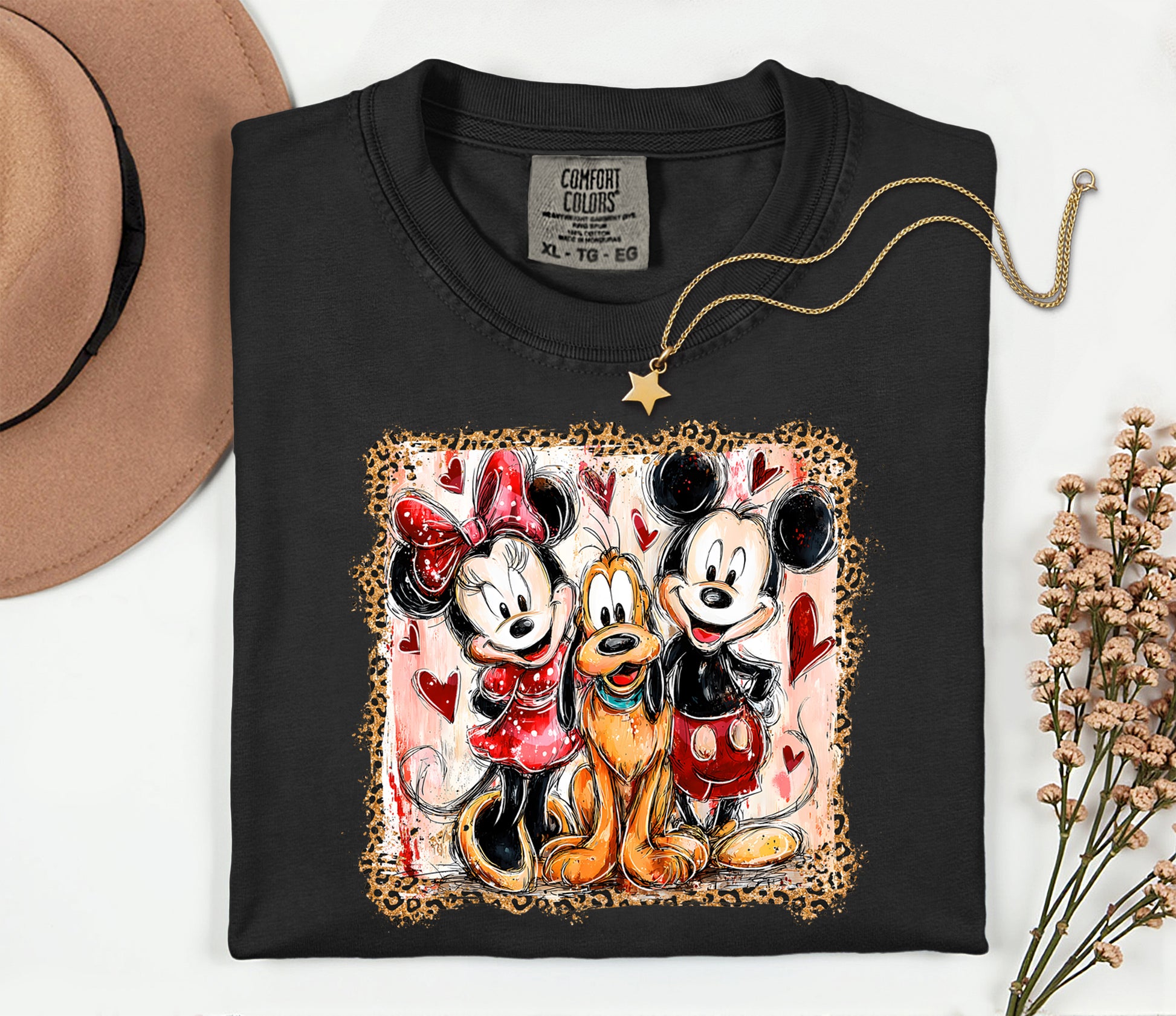 The Vintage Cartoon Trio Graphic Tee features an artsy illustration of three classic cartoon friends framed with heart accents and a trendy leopard-print border. Designed with a hand-painted, retro-inspired style, this tee brings cozy nostalgia with a fun, fashionable twist.